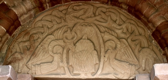 The church originally had a northern entrance (photo above right) which has been bricked up, although no-one seems willing to say whether this had anything to do with suppressing pagan die-hards. The southern entrance to the church has an impressive tympanum (photo left) depicting Kenelm with an angel on each side and serpents or dragons overhead.”